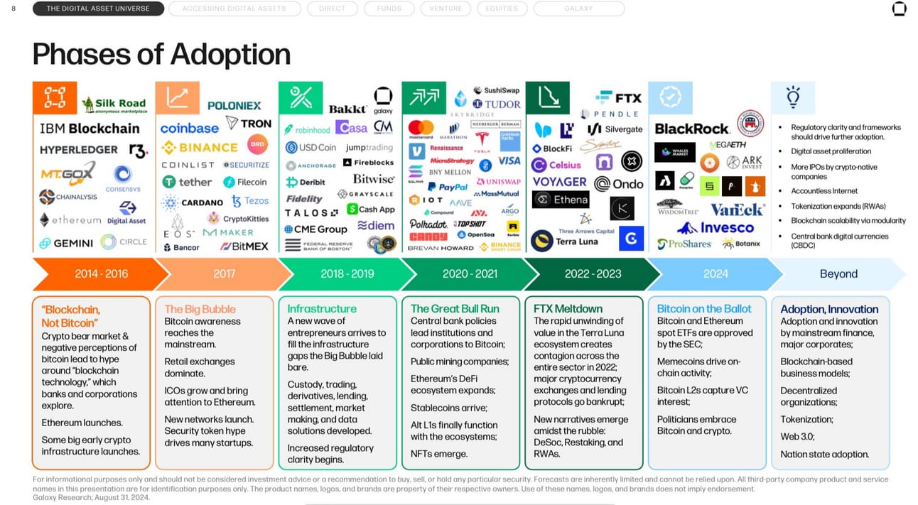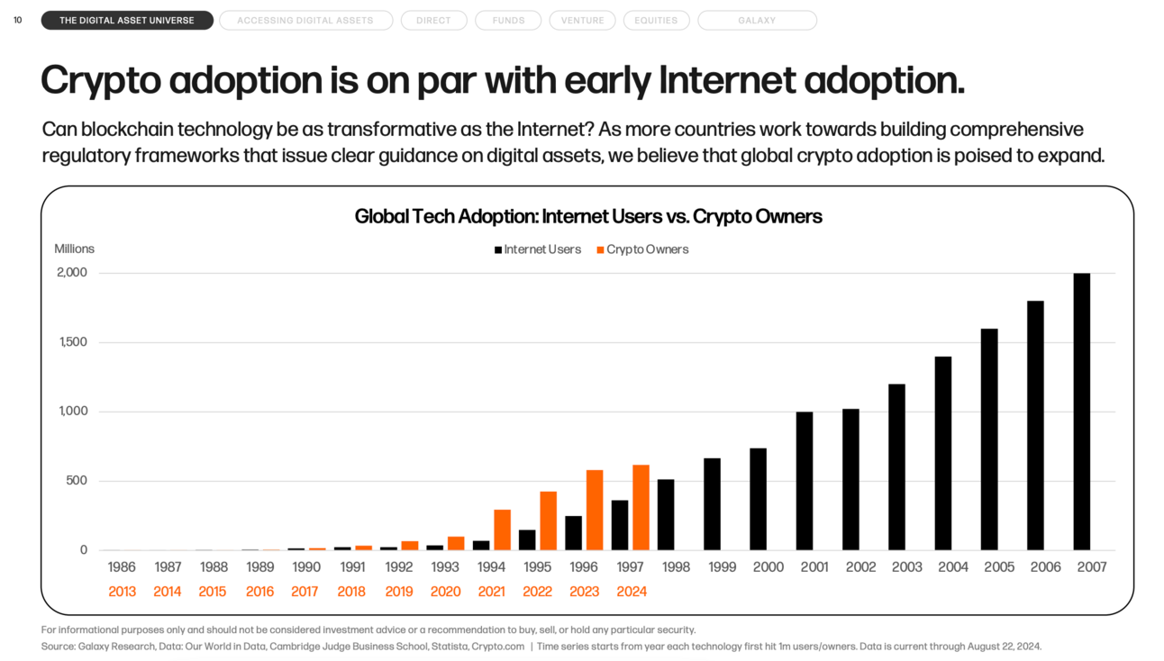 The report shows that despite accelerated adoption, itâs still early days. When compared to the Internetâs adoption curve, the cryptocurrency ecosystem is on a similar trajectory, akin to where the Internet was in 1997-1998.
