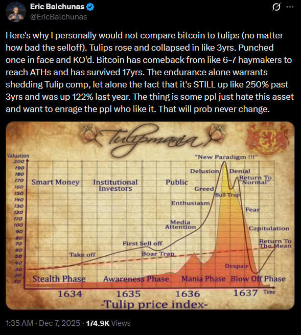 “Tulips rose and collapsed in like 3yrs. Punched once in face and KO'd. Bitcoin has comeback from like 6-7 haymakers to reach ATHs and has survived 17yrs.”