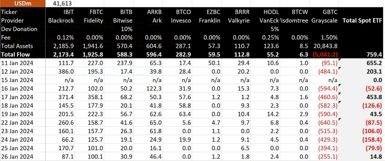 So, the question arises: what are the indicators, and why does Bitcoin seem to be reversing its downward trend? Given that it's all about supply and demand, it appears that GBTC outflows have slowed down, and there's now a total positive inflow in the Bitcoin Spot ETFs. On the 11th day of trading, the inflow reached a net positive $14.8 million, as reported by BitMEX Research.