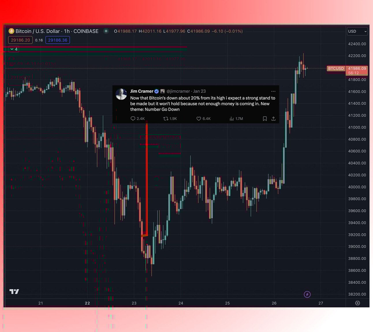 In a refreshing turn of events, the Bitcoin market experienced an 'Inverse Cramer' moment when the Mad Money host stated that the new theme for Bitcoin was 'Number Go Down,' leading to a rebound above $40,000.