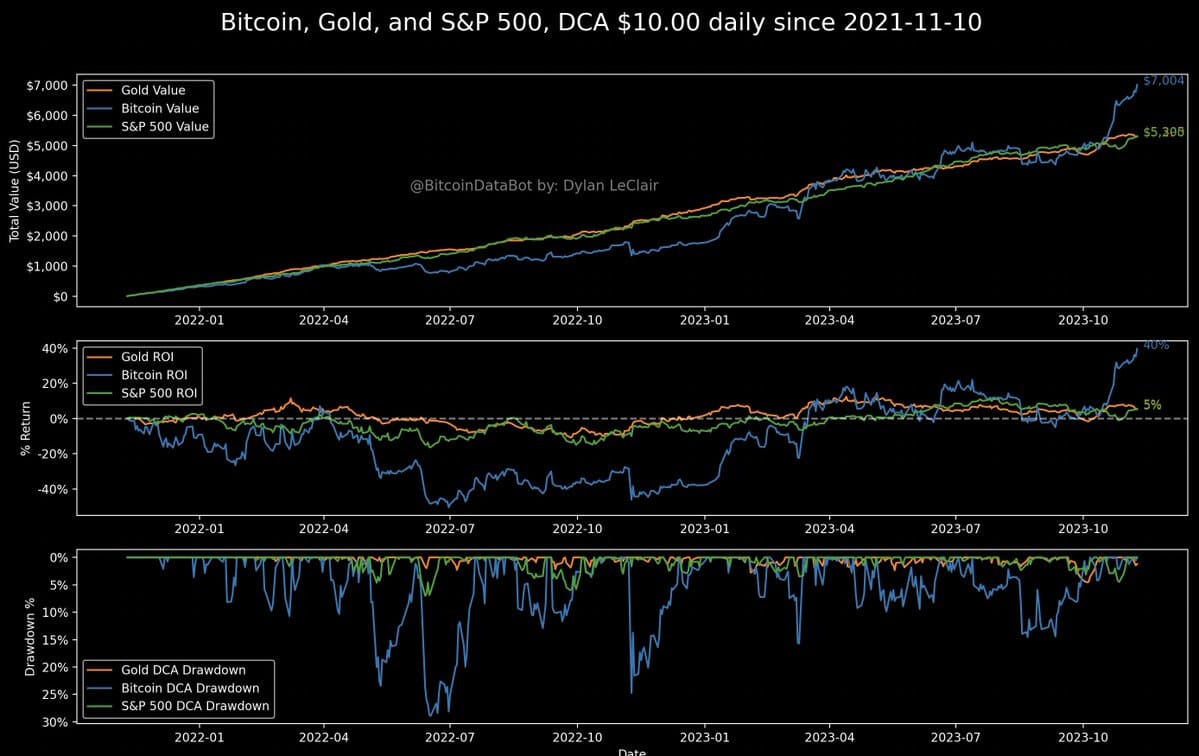 Dollar-cost averaging bitcoin, stocks, and gold, starting from 11/10/21, the day of the $69,000 bitcoin all-time high until today, showcases and puts bitcoin as the fastest horse: Bitcoin +40%, Gold +5%, S&P +5%
