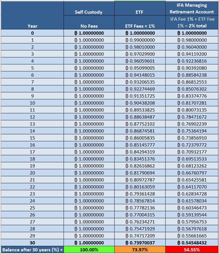 Over 30 years, ETF fees reduce BTC holdings by 46%.