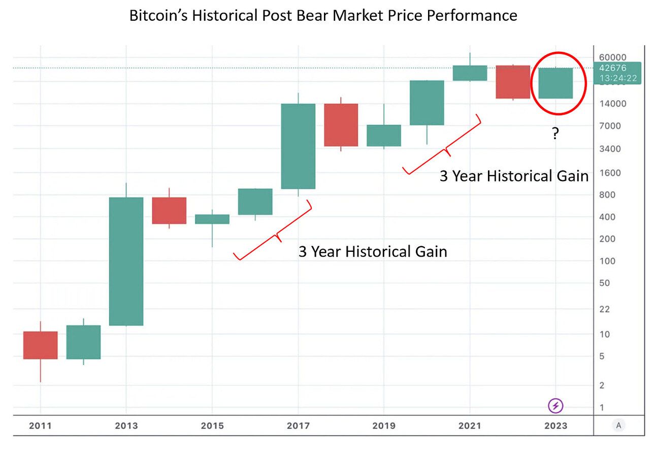 As the year concludes, Bitcoin has surged by almost 160% in 2023. Reviewing Bitcoin's history, the three years succeeding bear market lows often show positive trends. While history doesn't precisely repeat, it often rhymes.