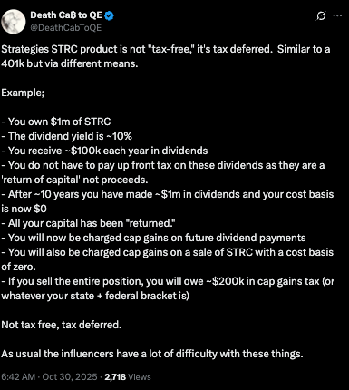 A recent video making the rounds highlights products like $STRC with its ~11% annual yield paid monthly and incorrectly marketed as “tax-free”. However the label is misleading. In reality, it’s not tax-free, but rather tax-deferred.