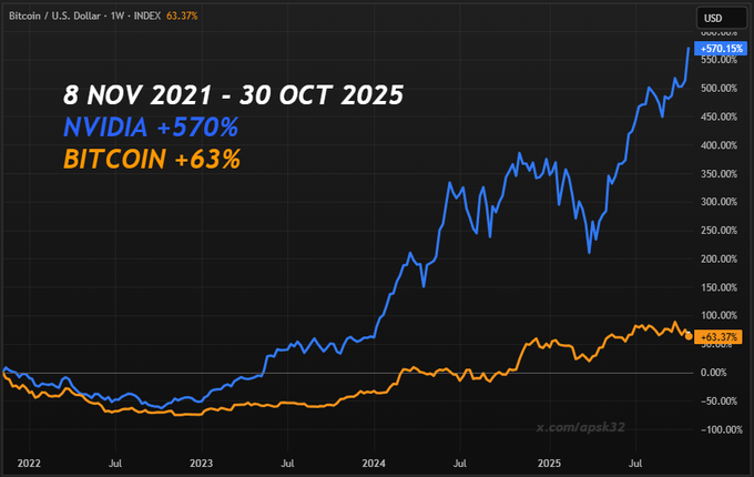 As a result, the “recessionista” narrative is making a comeback in Bitcoin circles. Despite strong year-to-date gains in Tech, AI, and even Bitcoin mining stocks, the mood remains cautious. Nvidia ($NVDA) is up 47% this year. Impressive for a $5 trillion company, yet Bitcoin’s legendary CAGR isn’t inspiring much confidence.