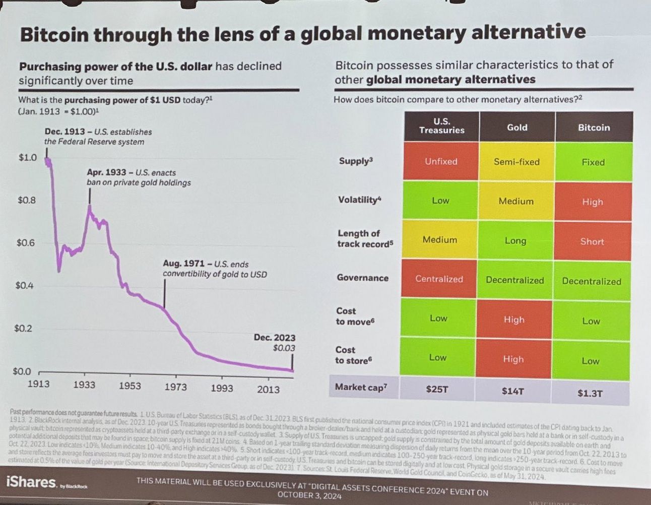 BlackRock presents its clients with a case for Bitcoin, featuring a chart that illustrates the sharp decline in the dollar’s purchasing power since the Federal Reserve's inception in 1913.