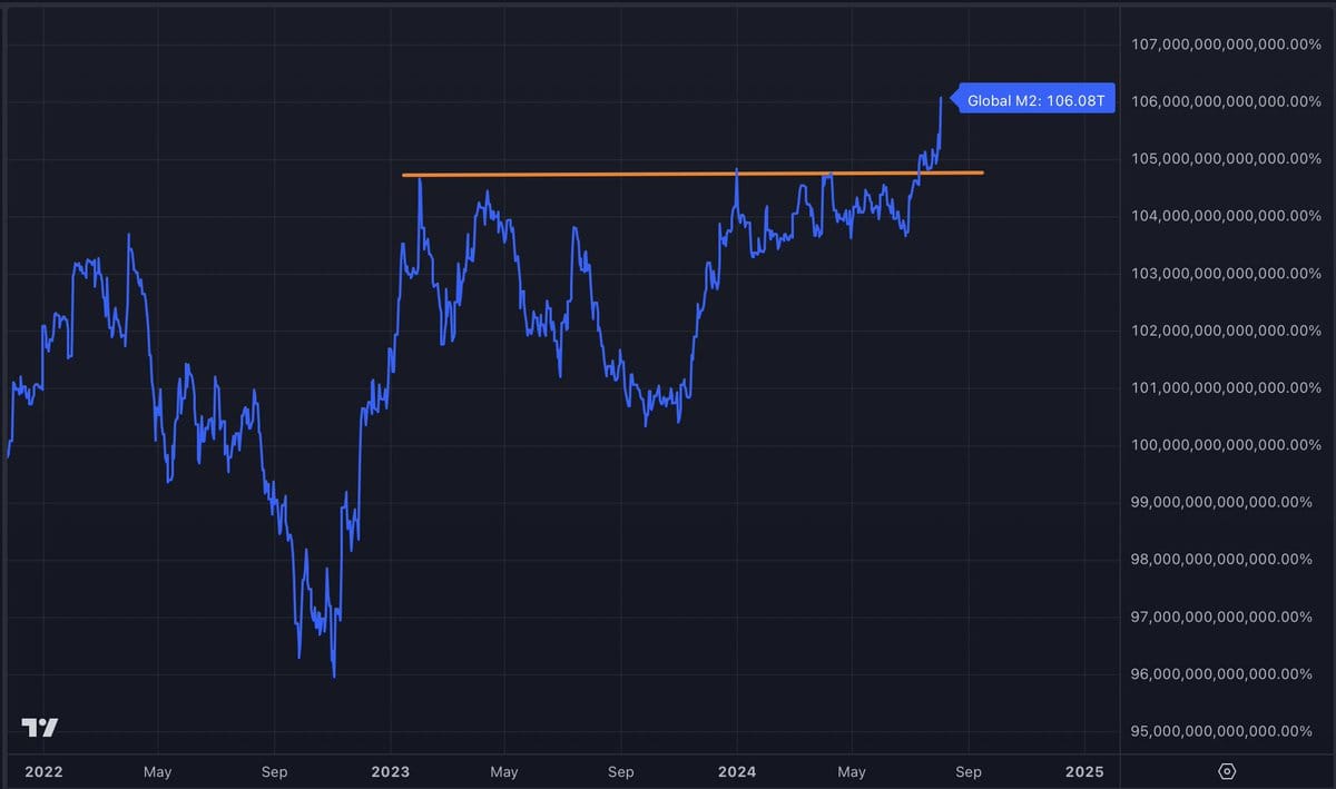 Nevertheless, liquidity is already starting to rise. China’s M2 money supply has finally reached new highs, following the trend of the global M2, which continues to climb higher after consolidating since 2022.