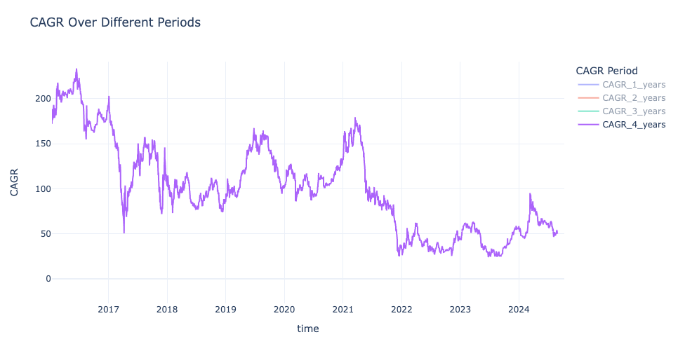 Let’s examine Bitcoin’s CAGR: over a 4-year term, the lowest recorded value is around 25%, observed in mid-2022 and mid-2023. At times, the CAGR is much higher, as seen earlier this year when it nearly reached 100% during Bitcoin’s run to a new ATH.