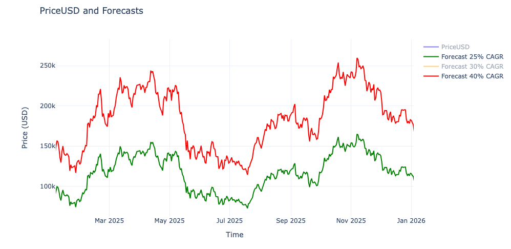 This got me thinking: What would next year look like if Bitcoin maintained a 25% CAGR? And what if the CAGR were slightly higher, as we typically see during bull runs? Naturally, I calculated it.