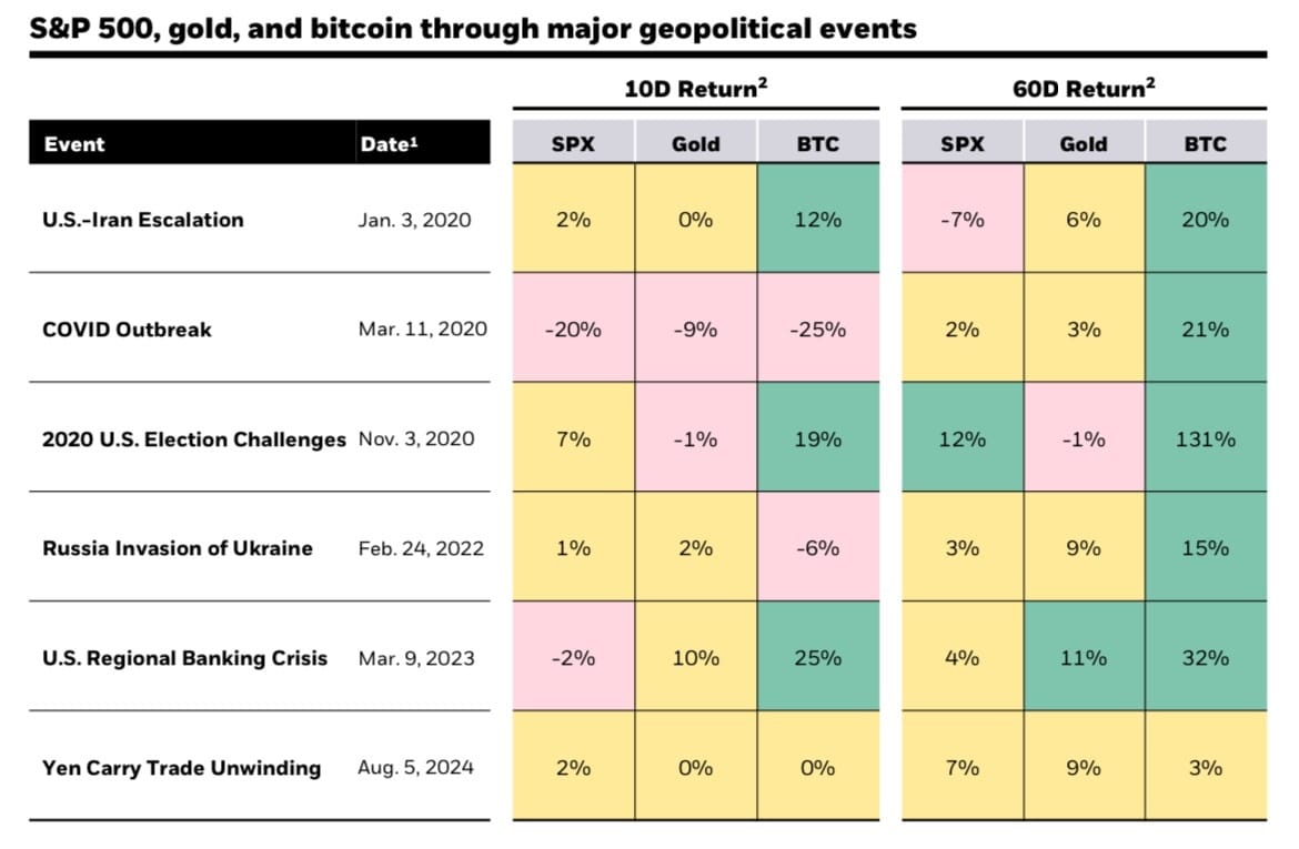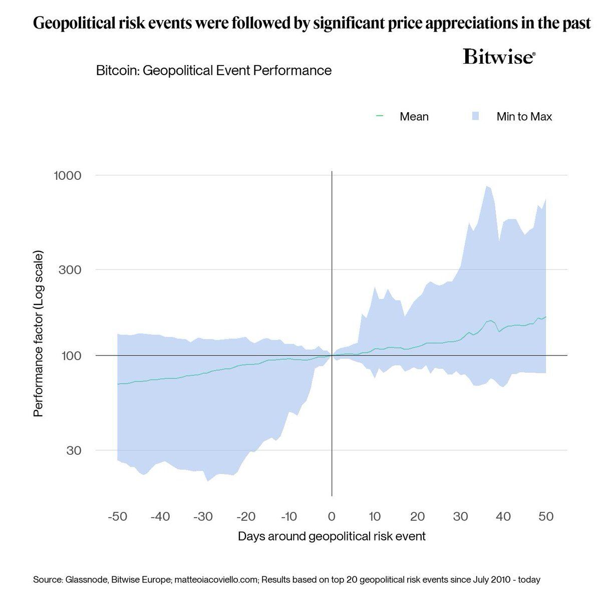 Across the top 20 geopolitical risk events since Bitcoin’s inception, Bitcoin has gained an average of 64.6% within 50 days after the event, with a median gain of 17.3%, outperforming both gold and stocks.