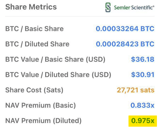 One detail that stood out: a major Bitcoin player (Semler Scientific) is now trading below its mNAV of 1. This implies the its market cap is lower than the value of its Bitcoin holdings, even after accounting for potential future dilution.