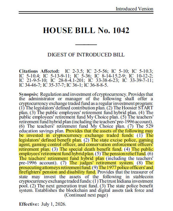 Indiana’s HB 1042 would require public retirement plans to offer at least one digital-asset-related ETF option.