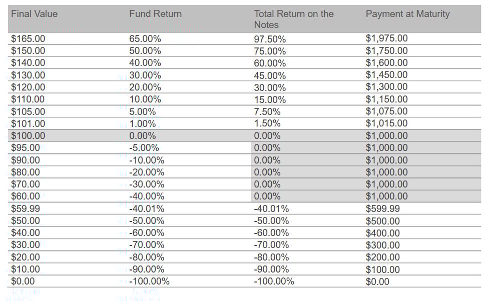This puts a cap on early gains. If by the end of 2026 the price of IBIT has doubled, or more, investors would still get a fixed 16% interest.