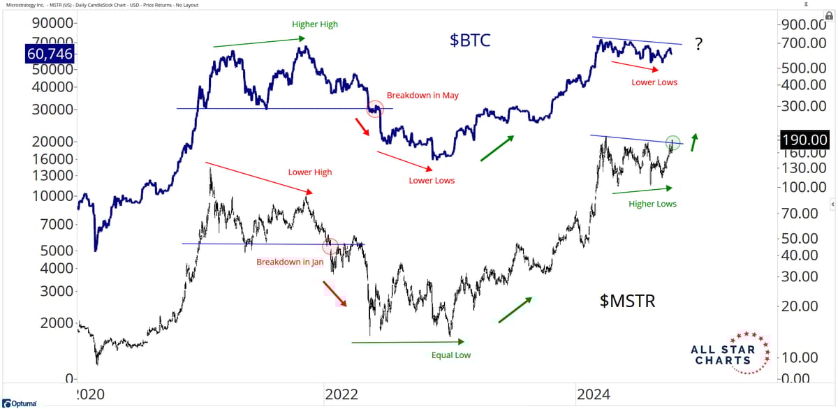 I’m getting excited after months of sideways movement, so here’s a speculative chart offering some optimism on how Bitcoin might mirror MicroStrategy’s breakout.
