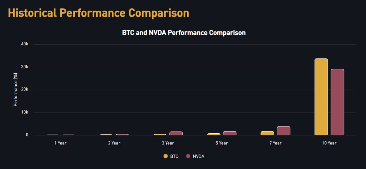 NVIDIA beats Bitcoin on every timeframe under a decade. But zoom out? Bitcoin destroys everything. The catch? You have to survive the boring parts to capture the violent upside.