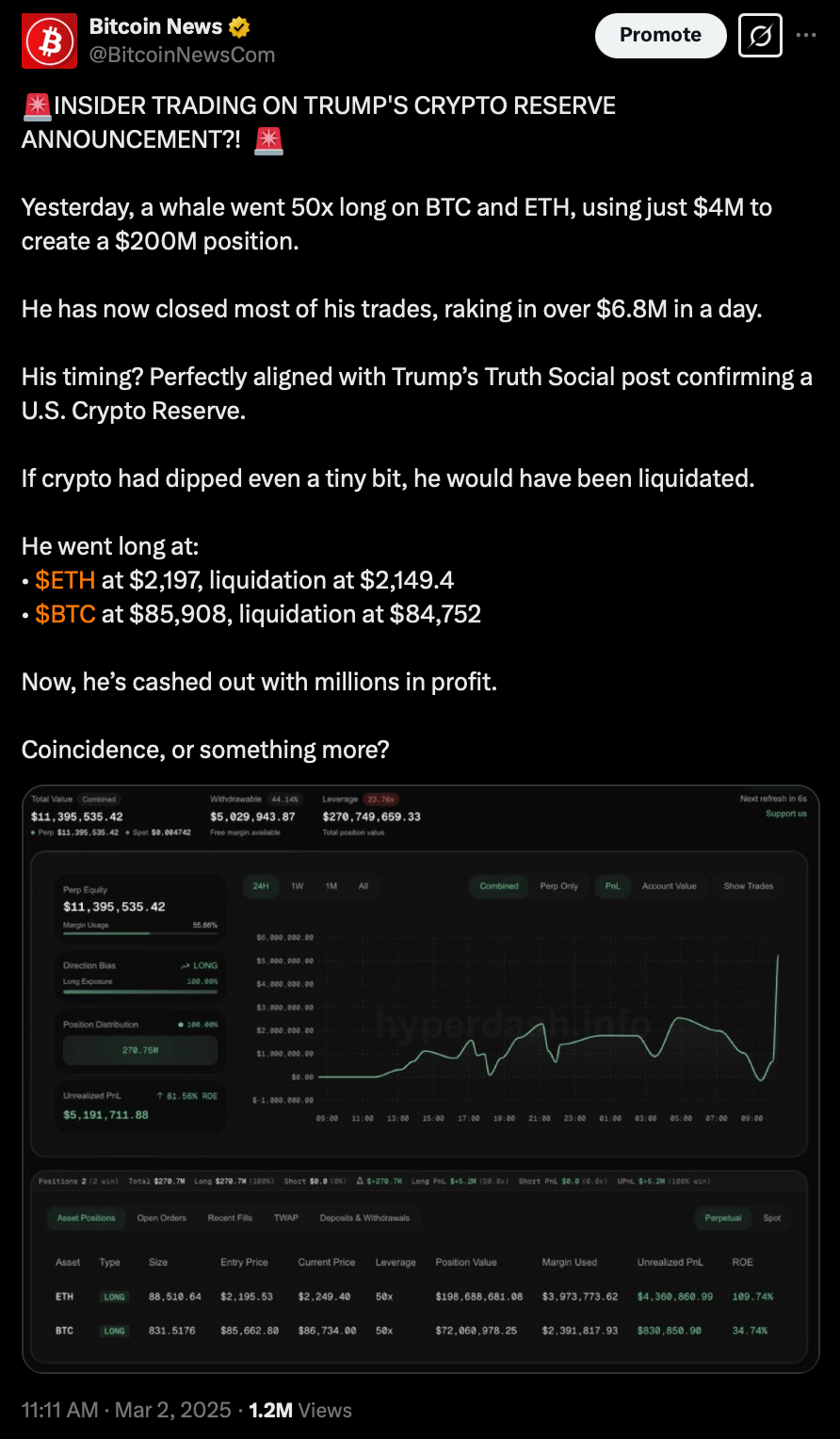 On Saturday, a whale opened a staggering $200 million leveraged position, 50x long on BTC and ETH, using just $4 million in capital. His entry was razor-thin: $85,908 for Bitcoin (liquidation at $84,752) and $2,197 for Ethereum (liquidation at $2,149.40). By Sunday, as Trump’s posts hit, he closed most of his trades, pocketing $6.8 million in a single day. A slight dip would’ve wiped him out. Instead, his timing synced perfectly with the Reserve announcement. Coincidence? Or did someone know what was coming?