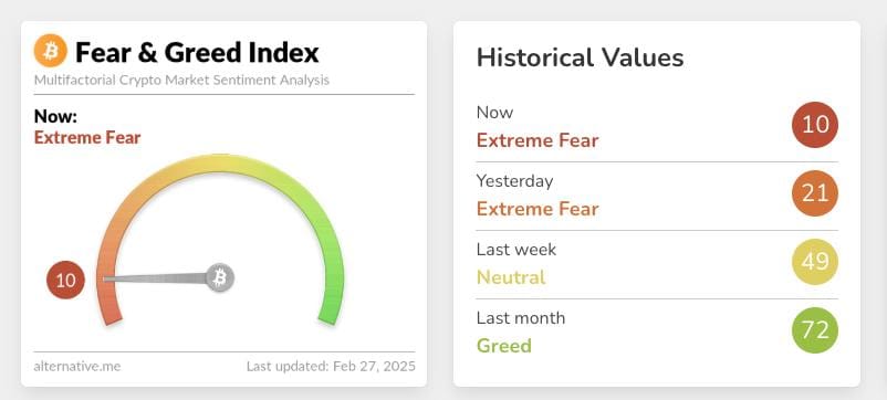 But the euphoria didn’t last. Over the past month, Bitcoin struggled to hold above $100,000, drifting sideways before a brutal 28% plunge on Monday sent it crashing to $78,000. Sentiment cratered to a Fear & Greed Index reading of 10 (levels not seen since the FTX collapse), as chatter on X questioned whether the bull market had topped out.