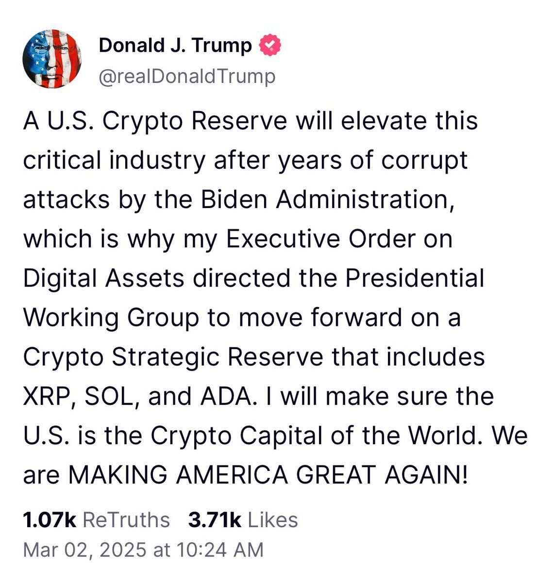 Then came Sunday, March 2, 2025, when Trump dropped a bombshell. At 10:24 AM ET, he posted on Truth Social, announcing he’d directed the Presidential Working Group to advance a “Crypto Strategic Reserve” including XRP, SOL, and ADA.
