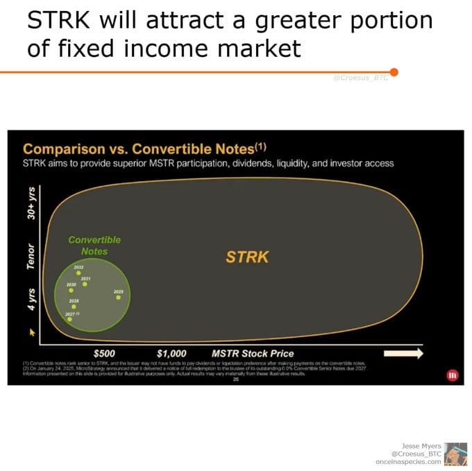 Beyond the yield, STRK includes a built-in conversion feature, allowing investors to capture MicroStrategy’s potential upside if its Bitcoin thesis holds. This creates the possibility of unlimited returns, far beyond the already attractive fixed yield.