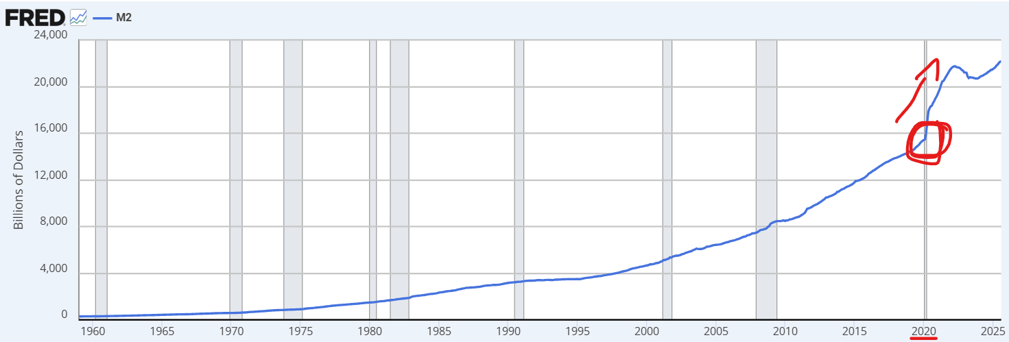 Here's a number worth remembering: Since 2020, M2 money supply increased by over $6 trillion - a 40% expansion in just four years (red circle below).