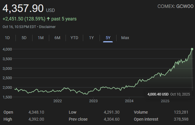 Look at gold. Boomers bought gold watches in the 1990s when gold traded around $400/ounce. Seemed expensive then - a luxury splurge. Today they're selling those same watches with gold over $4,300/ounce, over a 10x return.