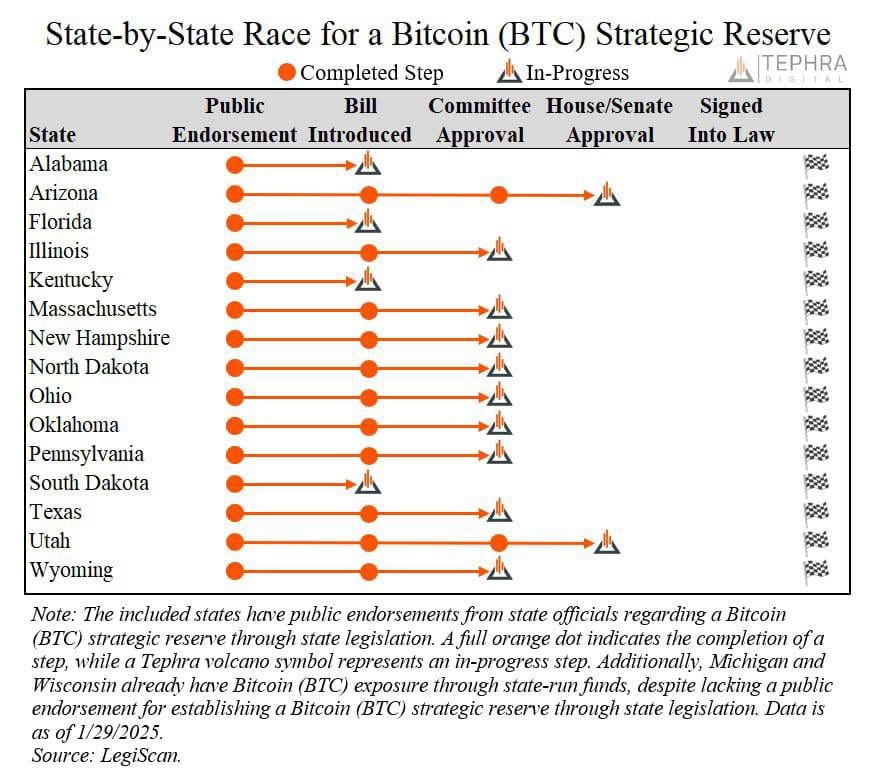 Cheat sheet provides the current status of all 15 state-level Strategic Bitcoin Reserve bills.