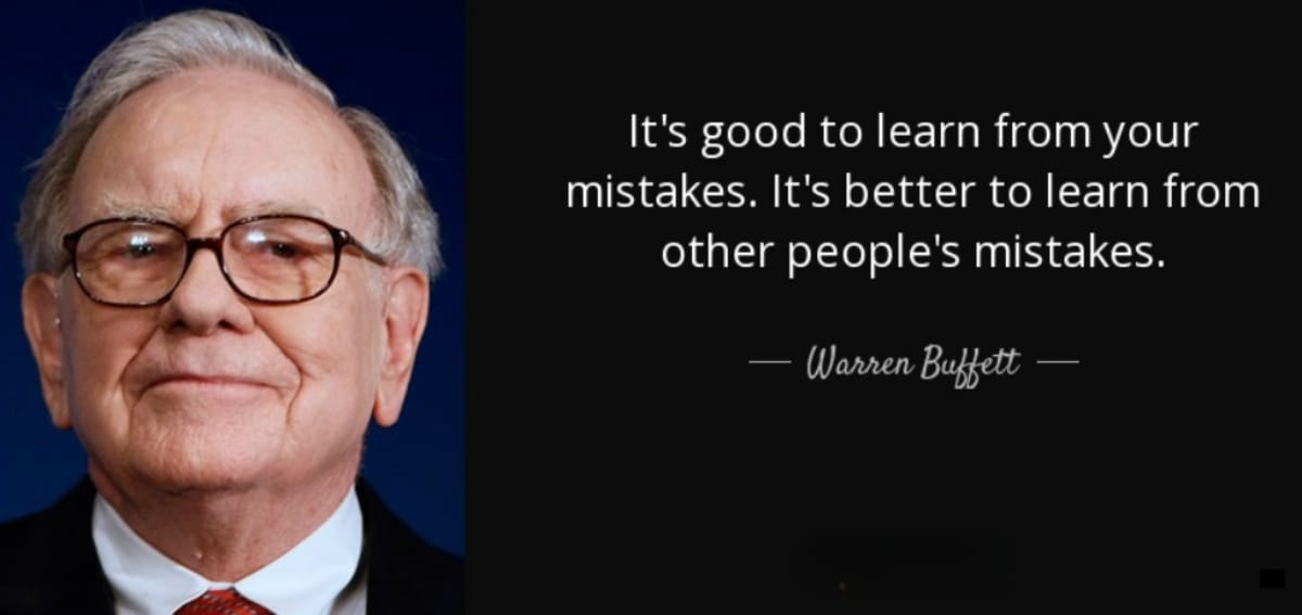 Warren Buffet recommends learning from other’s mistakes (its cheaper and a lot easier). Unfortunately for us, we’re more likely to learn from our own mistakes (hence the importance of always having a bias towards action).