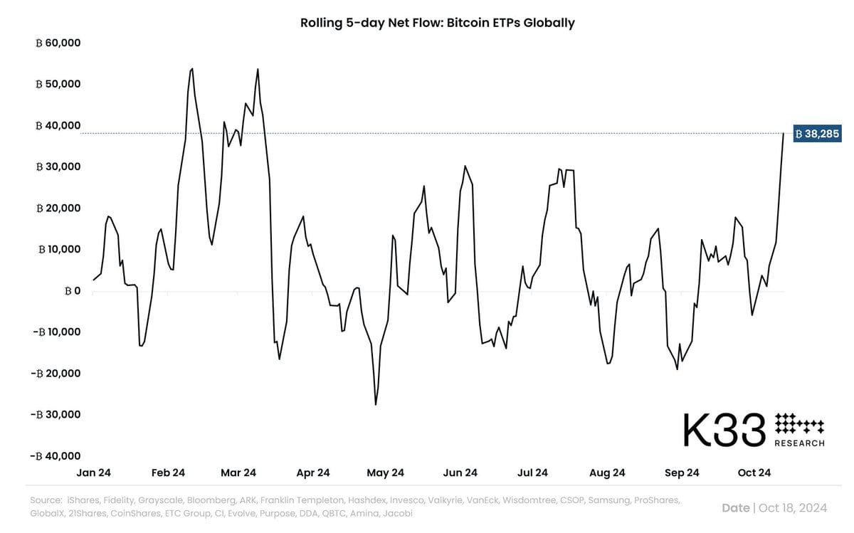 While the future is uncertain, we can look at what’s happening now. Global Bitcoin ETFs had a huge week, with 38,252 BTC absorbed in just 5 trading days—similar to when ETFs first launched earlier this year, driving Bitcoin to new all-time highs after a long bear market. This surge has pushed assets under management to new records, as global Bitcoin ETFs now hold over 1.2 million BTC for the first time—more than Satoshi’s holdings!